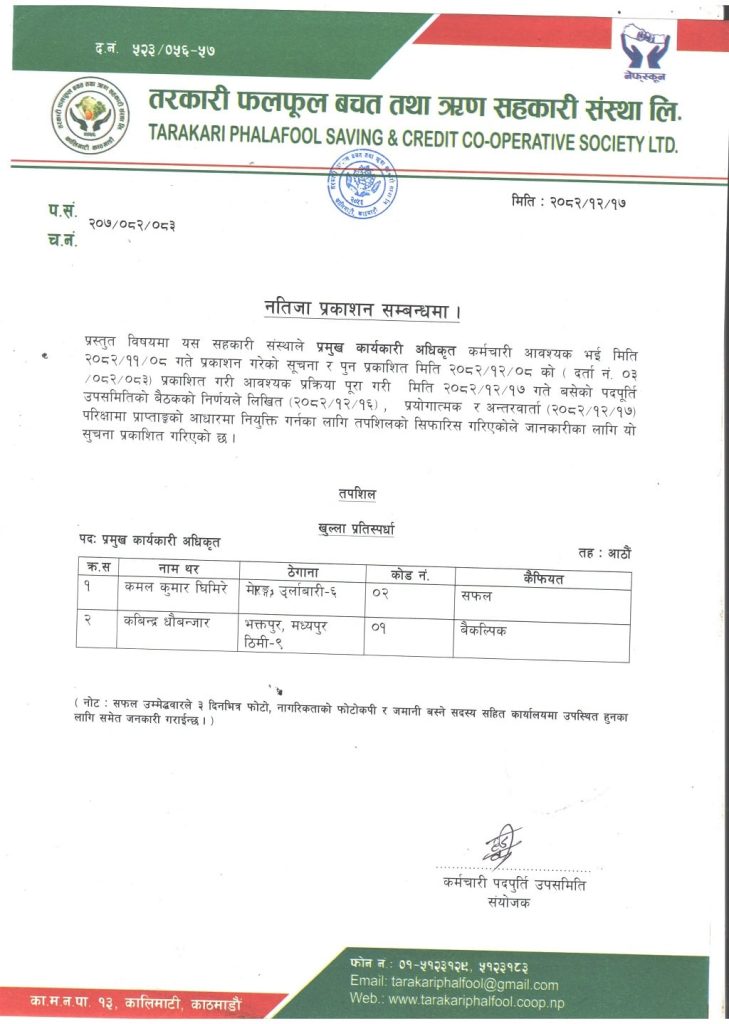 सहकारी ऐन २०४८ बमोजिम स्थापना भई सहकारी ऐन २०७४ अनुसार संचालित यस तरकारी फलफूल बचत तथा ऋण सहकारी संस्था लि. (Tarakari Phalafool Saving and Credit Co–Operative Society Ltd.) काठमाण्डौँ जिल्लाभरी कार्यक्षेत्र कायम गरी विधिवत रुपमा डिभिजन सहकारी कार्यालय काठमाण्डौँमा वि.सं. २०५६ साल माघ २१ गते ३० जना सदस्यहरुबाट रु. ३१९०० (अक्षेरेपी एकतीस हजार नौ सय मात्र) शेयर पूँजी संकलन गरी स्थापना भएको संस्था हो । यस संस्थाको प्रधान कार्यालय काठमाडौं वडा नं १३ , कालीमाटीमा रहेको छ भने सदस्य सेवा काउन्टर काठमाडौं वडा नं १४ , बल्खु तरकारी बजारमा रहेको छ । यस सहकारी संस्थाले छरिएर रहेको रकम संकलन गरी पुजीँ निर्माण गर्ने साथै बचत गर्ने वानीको विकास गरी संकलित रकमलाई व्यवसाय वुद्धि , उद्यमशिलता , सीपमूलक परियोजना लगायतका क्षेत्रमा लगानी गर्न प्रोत्साहन गर्ने साथै त्यसका लागि पूर्वाधारहरुको व्यवस्था मिलाईदिने आवश्यक परेको खण्डमा आफ्नो सदस्यहरुलाई सुहाउदो व्याजदरमा छिटो छरितो र सहज ढङ्गबाट ऋण प्रवाह गर्नुका साथै सदस्यहरुको हितका लागि सामाजिक गतिविधीका कार्य गर्ने गरी आफ्नो लक्ष्य उद्धेश्य र ध्येयका साथ तरकारी फलफूलका व्यवसायीमाझ वित्तिय छहारीको रुपमा स्थापित यस सहकारी संस्था सदस्य केन्द्रित र सेवामुखी सामाजिक उत्तरदायित्व बोकेको सक्षम र वित्तिय रुपमा सबल संस्था हो ।